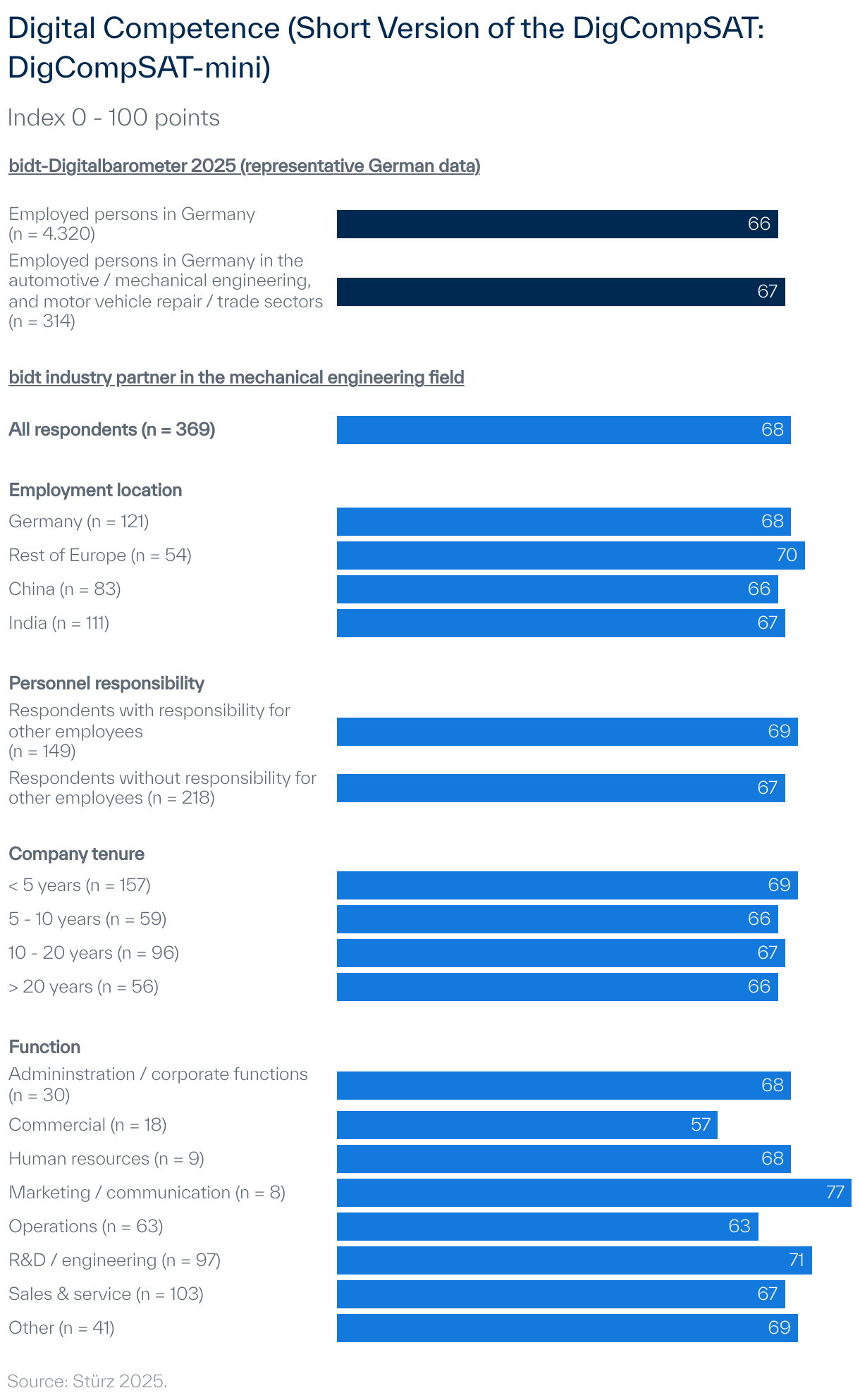 The results show that the surveyed employees of the mechanical engineering company from Germany, with an average of 68 points, have similar digital skills to employees in the vehicle and mechanical engineering sector and vehicle repair and trade in Germany in general (67 points). Employees at the company in other European countries scored slightly higher at 70 points. The average values for employees surveyed in China (66 points) and India (67 points) are slightly lower than the value determined for Germany. Employees with personnel responsibility have slightly higher digital skills (69 points) than employees without personnel responsibility (67 points). In terms of length of service, it can be seen that new employees have slightly higher digital skills than employees who have been with the company for longer. There are greater differences in digital skills by functional area. For example, employees in Marketing/Communications achieve the highest competence score, while employees in Commercial achieve the lowest.