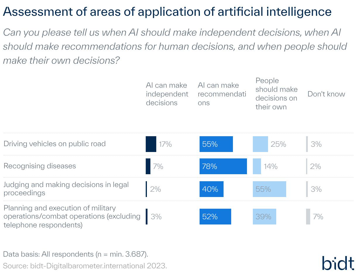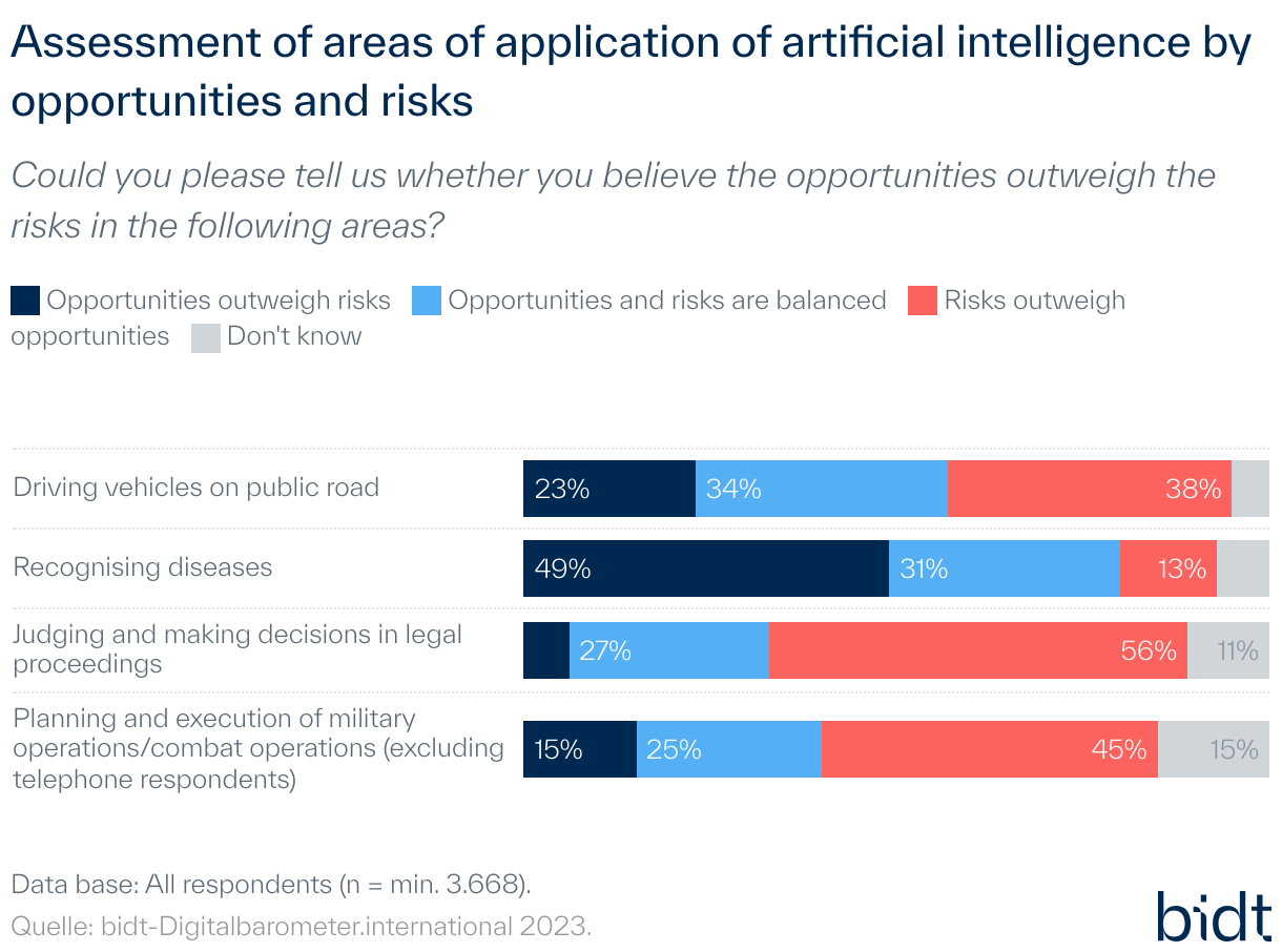 Furthermore considering the acceptance of AI by field of application, there are clear differences. The opportunity-risk assessment of AI and the perception of whether AI should be involved in decisions or not are predominant. For example, the opportunities of AI are predominantly perceived in the detection and treatment of diseases, and a large majority would like to see suggestions from AI. In contrast, when it comes to judgements and decisions in court proceedings, the risks are predominantly perceived and significantly fewer people would like to see AI suggestions.