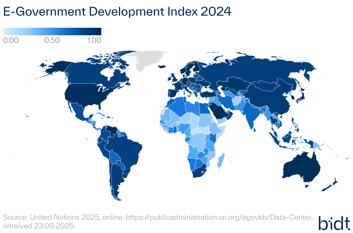 The E-Government Development Index values range from 0 to 1 and express the performance of countries in the three sub-indices in relation to each other. Accordingly, the scores are not based on a fixed scale, but follow a relative logic whereby a country could theoretically achieve a total score of 1 if it achieved the best result in each sub-index. In 2024, Denmark led the ranking for the fourth time in a row with a score of 0.98. Germany, on the other hand, has recently improved its performance significantly from 0.85 in 2020 to 0.94 in 2024, currently placing 12th in the international ranking.